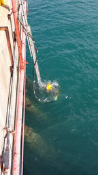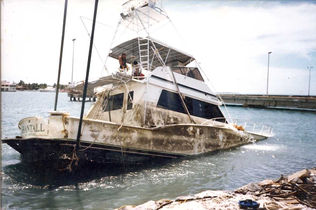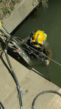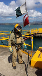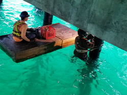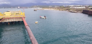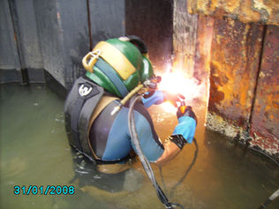 Peerless Oil & Chemical main loading dock. Overhead welding in three foot space below pier standing on pile clamp platform.